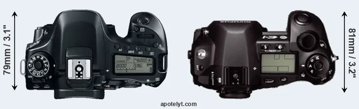An illustration of the physical size and weight of the Canon 80D and the Olympus E-1 is provided in the side-by-side display below. The two cameras are presented according to their relative size. Three consecutive perspectives from the front, the top, and the back are available. All width, height and depth dimensions are rounded to the nearest millimeter.