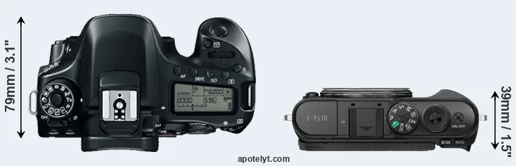 An illustration of the physical size and weight of the Canon 80D and the Olympus E-PL10 is provided in the side-by-side display below. The two cameras are presented according to their relative size. Three successive views from the front, the top, and the rear are shown. All width, height and depth dimensions are rounded to the nearest millimeter.