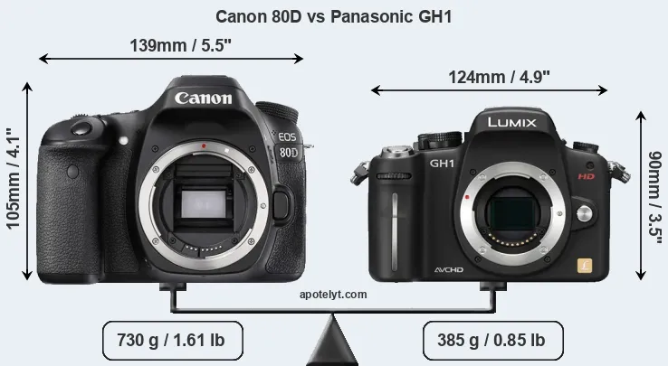If the front view area (width x height) of the cameras is taken as an aggregate measure of their size, the Panasonic GH1 is notably smaller (24 percent) than the Canon 80D. Moreover, the GH1 is substantially lighter (47 percent) than the 80D. It is worth mentioning in this context that the 80D is splash and dust resistant, while the GH1 does not feature any corresponding weather-sealing.