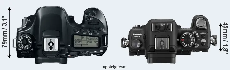 The physical size and weight of the Canon 80D and the Panasonic GH1 are illustrated in the side-by-side display below. The two cameras are presented according to their relative size. Three successive views from the front, the top, and the rear are shown. All width, height and depth dimensions are rounded to the nearest millimeter.
