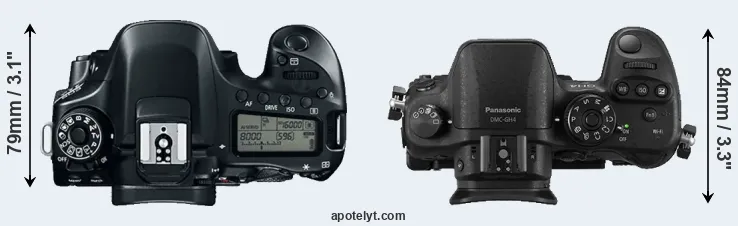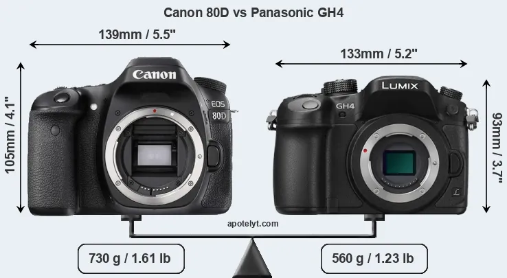 The physical size and weight of the Canon 80D and the Panasonic GH4 are illustrated in the side-by-side display below. The two cameras are presented according to their relative size. Three successive views from the front, the top, and the rear are shown. All width, height and depth measures are rounded to the nearest millimeter.