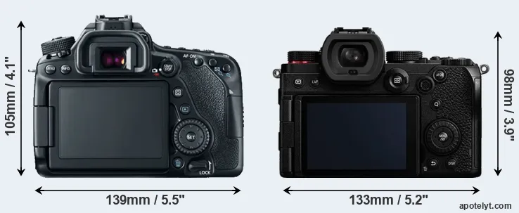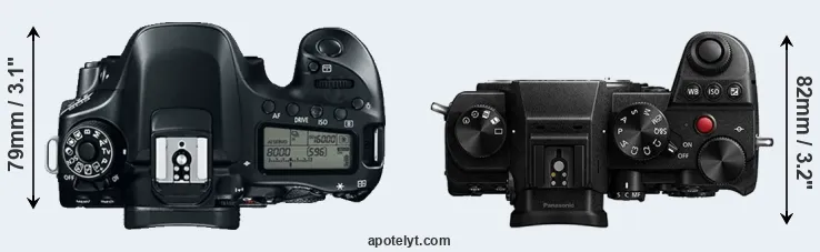 The side-by-side display below illustrates the physical size and weight of the Canon 80D and the Panasonic S5. The two cameras are presented according to their relative size. Three successive views from the front, the top, and the rear are shown. All size dimensions are rounded to the nearest millimeter.