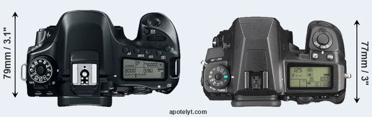 The physical size and weight of the Canon 80D and the Pentax K-3 are illustrated in the side-by-side display below. The two cameras are presented according to their relative size. Three consecutive perspectives from the front, the top, and the back are available. All width, height and depth dimensions are rounded to the nearest millimeter.