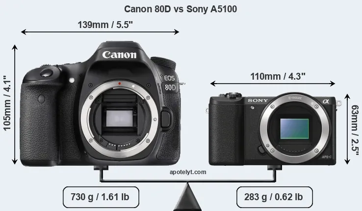 If the front view area (width x height) of the cameras is taken as an aggregate measure of their size, the Sony A5100 is considerably smaller (53 percent) than the Canon 80D. Moreover, the A5100 is substantially lighter (61 percent) than the 80D. It is worth mentioning in this context that the 80D is splash and dust resistant, while the A5100 does not feature any corresponding weather-sealing.