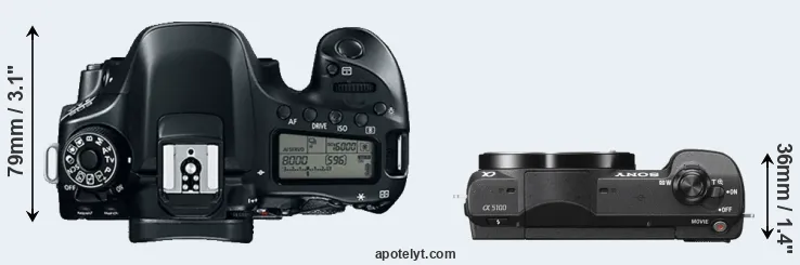 An illustration of the physical size and weight of the Canon 80D and the Sony A5100 is provided in the side-by-side display below. The two cameras are presented according to their relative size. Three successive views from the front, the top, and the rear are shown. All width, height and depth measures are rounded to the nearest millimeter.