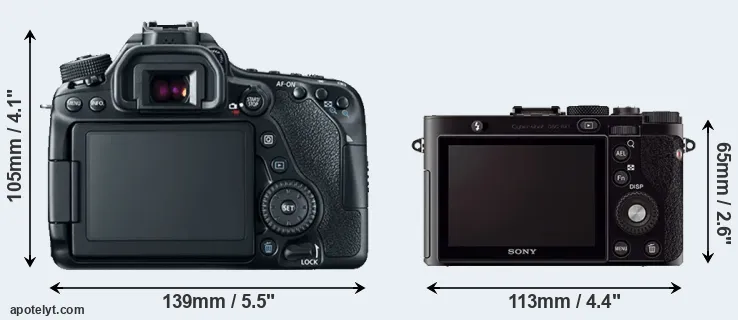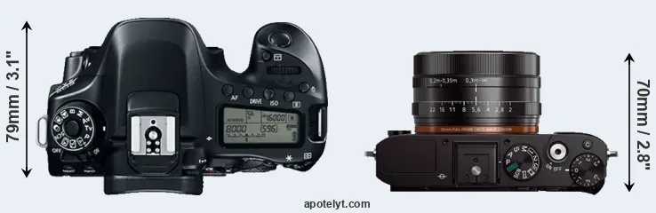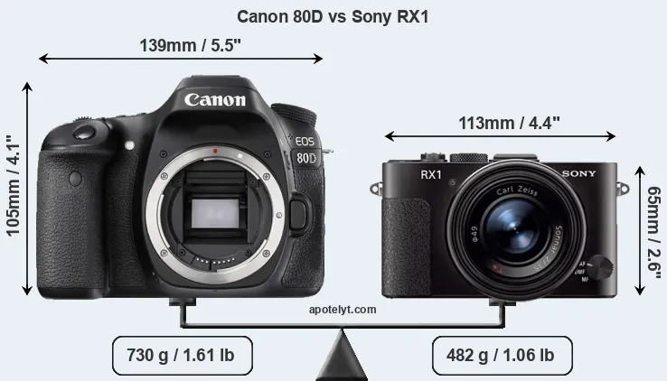 The side-by-side display below illustrates the physical size and weight of the Canon 80D and the Sony RX1. The two cameras are presented according to their relative size. Three consecutive perspectives from the front, the top, and the back are available. All width, height and depth measures are rounded to the nearest millimeter.