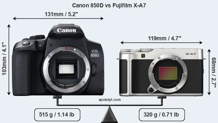 The side-by-side display below illustrates the physical size and weight of the Canon 850D and the Fujifilm X-A7. The two cameras are presented according to their relative size. Three consecutive perspectives from the front, the top, and the back are available. All width, height and depth measures are rounded to the nearest millimeter.