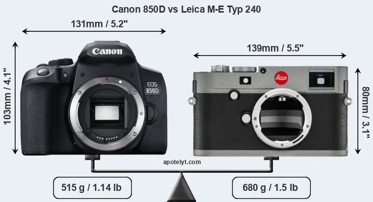 The physical size and weight of the Canon 850D and the Leica M-E Typ 240 are illustrated in the side-by-side display below. The two cameras are presented according to their relative size. Three consecutive perspectives from the front, the top, and the back are available. All width, height and depth dimensions are rounded to the nearest millimeter.