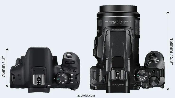 The physical size and weight of the Canon 850D and the Nikon P950 are illustrated in the side-by-side display below. The two cameras are presented according to their relative size. Three consecutive perspectives from the front, the top, and the back are available. All width, height and depth dimensions are rounded to the nearest millimeter.