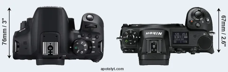 The side-by-side display below illustrates the physical size and weight of the Canon 850D and the Nikon Z6. The two cameras are presented according to their relative size. Three successive views from the front, the top, and the rear are shown. All width, height and depth dimensions are rounded to the nearest millimeter.