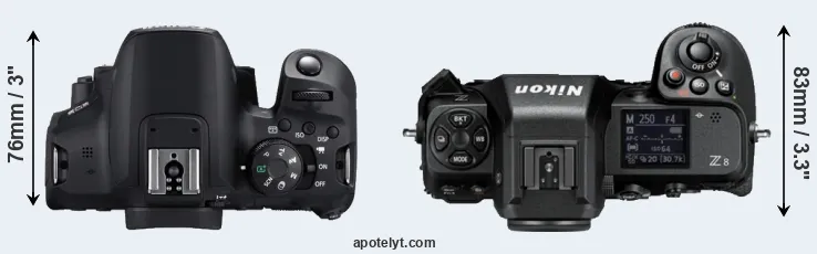 The side-by-side display below illustrates the physical size and weight of the Canon 850D and the Nikon Z8. The two cameras are presented according to their relative size. Three successive views from the front, the top, and the rear are shown. All size dimensions are rounded to the nearest millimeter.