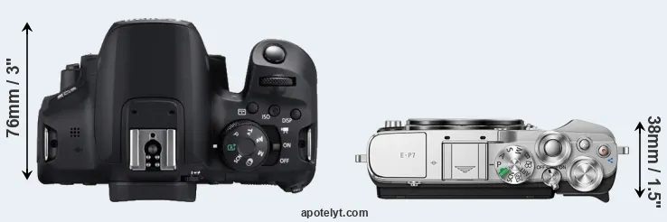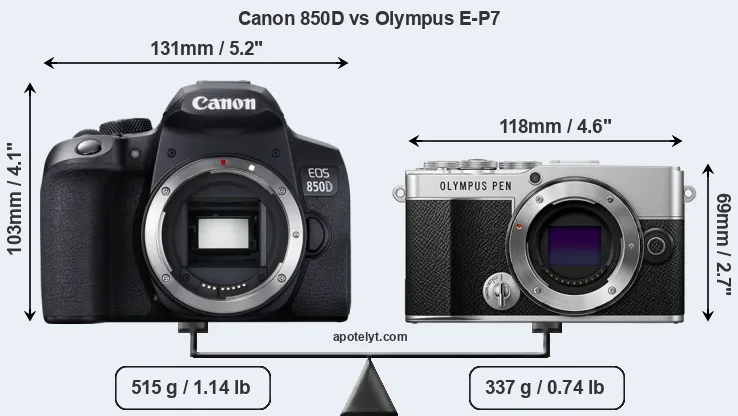 The physical size and weight of the Canon 850D and the Olympus E-P7 are illustrated in the side-by-side display below. The two cameras are presented according to their relative size. Three successive views from the front, the top, and the rear are shown. All width, height and depth dimensions are rounded to the nearest millimeter.