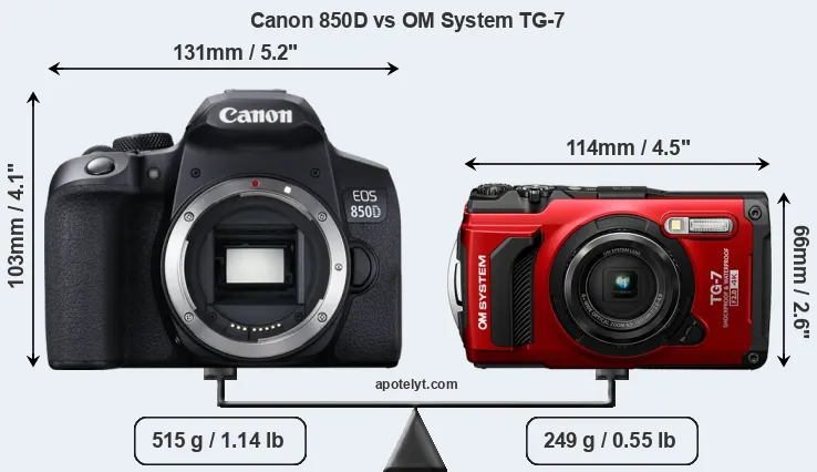The above size and weight comparisons are to some extent incomplete and possibly misleading, as the TG-7 has a lens built in, whereas the 850D is an interchangeable lens camera that requires a separate lens. Attaching the latter will add extra weight and bulk to the setup. You can compare the optics available for the 850D and their specifications in the Canon EF Lens Catalog.