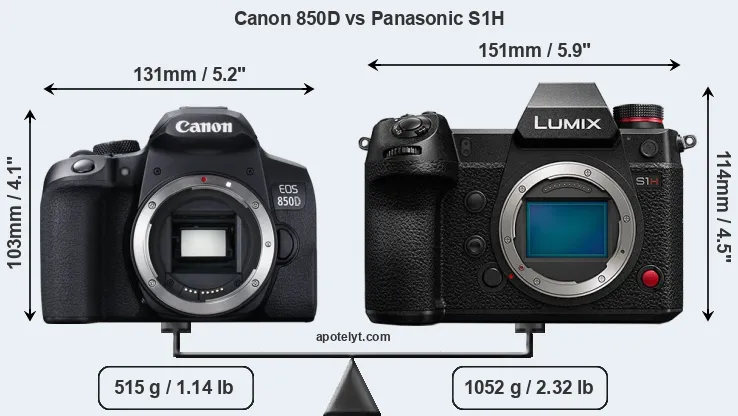 If the front view area (width x height) of the cameras is taken as an aggregate measure of their size, the Panasonic S1H is notably larger (28 percent) than the Canon 850D. Moreover, the S1H is substantially heavier (104 percent) than the 850D. It is noteworthy in this context that the S1H is splash and dust-proof, while the 850D does not feature any corresponding weather-sealing.