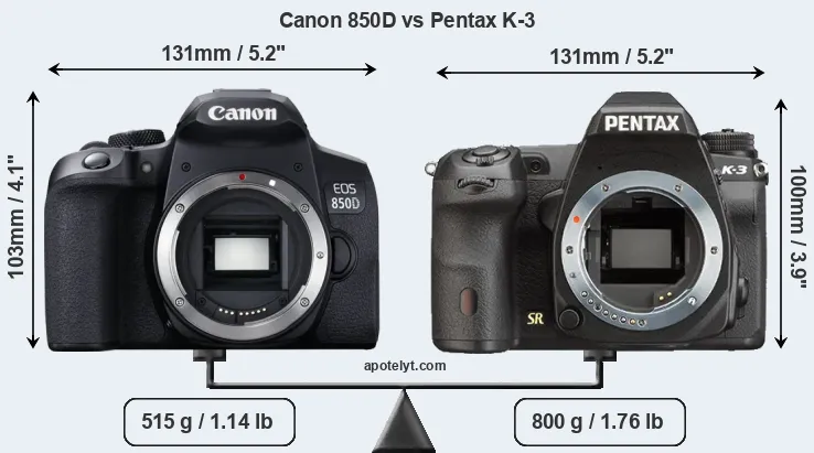 The side-by-side display below illustrates the physical size and weight of the Canon 850D and the Pentax K-3. The two cameras are presented according to their relative size. Three consecutive views from the front, the top, and the rear side are shown. All width, height and depth dimensions are rounded to the nearest millimeter.