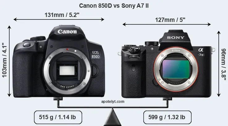 The side-by-side display below illustrates the physical size and weight of the Canon 850D and the Sony A7 II. The two cameras are presented according to their relative size. Three consecutive perspectives from the front, the top, and the back are available. All width, height and depth measures are rounded to the nearest millimeter.