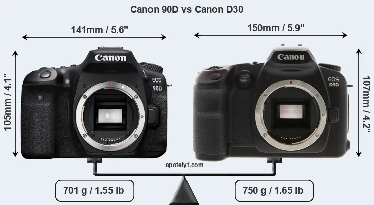 The side-by-side display below illustrates the physical size and weight of the Canon 90D and the Canon D30. The two cameras are presented according to their relative size. Three successive views from the front, the top, and the rear are shown. All size dimensions are rounded to the nearest millimeter.