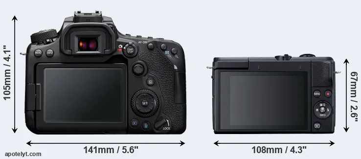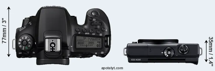 The physical size and weight of the Canon 90D and the Canon M200 are illustrated in the side-by-side display below. The two cameras are presented according to their relative size. Three consecutive perspectives from the front, the top, and the back are available. All size dimensions are rounded to the nearest millimeter.