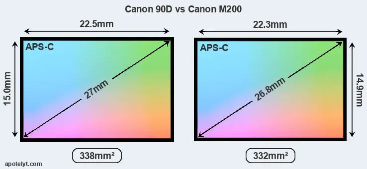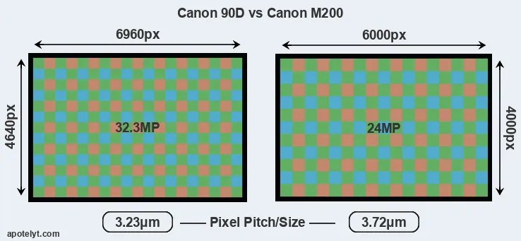 With 32.3MP, the 90D offers a higher resolution than the M200 (24MP), but the 90D has smaller individual pixels (pixel pitch of 3.23μm versus 3.72μm for the M200). It is noteworthy in this context that the two cameras were released in close succession, so that their sensors are from the same technological generation.