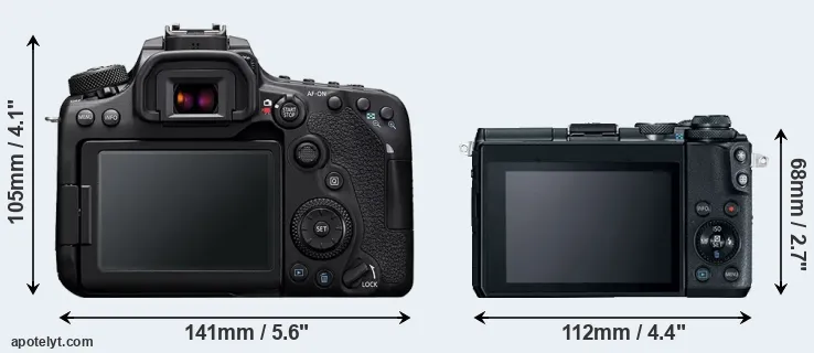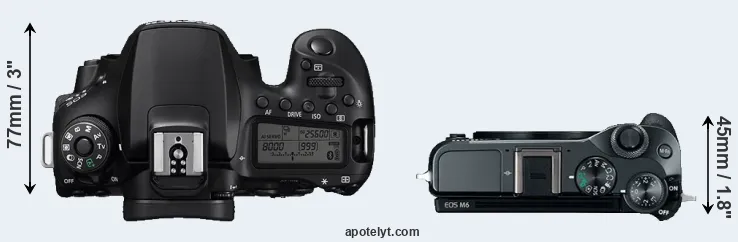 An illustration of the physical size and weight of the Canon 90D and the Canon M6 is provided in the side-by-side display below. The two cameras are presented according to their relative size. Three consecutive perspectives from the front, the top, and the back are available. All size dimensions are rounded to the nearest millimeter.