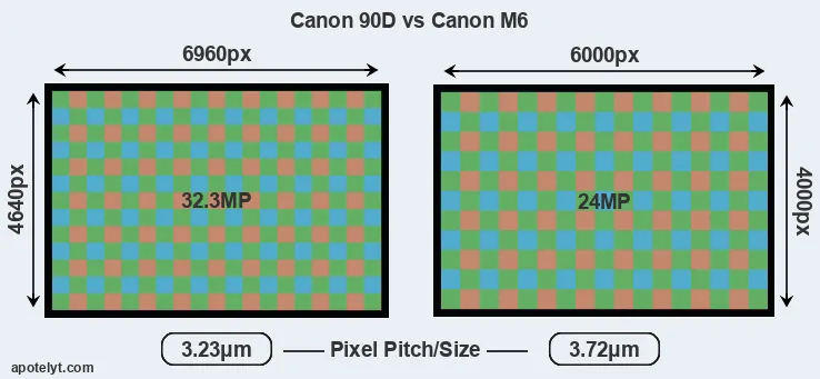 With 32.3MP, the 90D offers a higher resolution than the M6 (24MP), but the 90D has smaller individual pixels (pixel pitch of 3.23μm versus 3.72μm for the M6). However, the 90D is a much more recent model (by 2 years and 6 months) than the M6, and its sensor will have benefitted from technological advances during this time that enhance the light gathering capacity of its pixels.