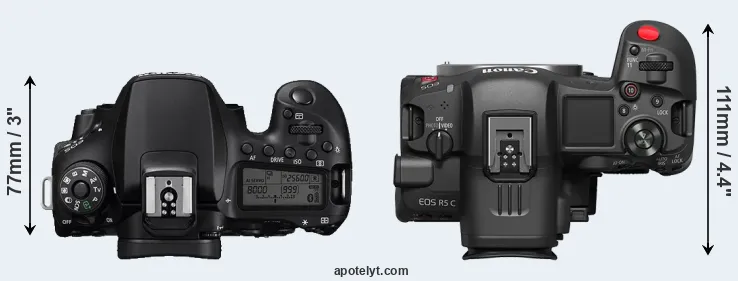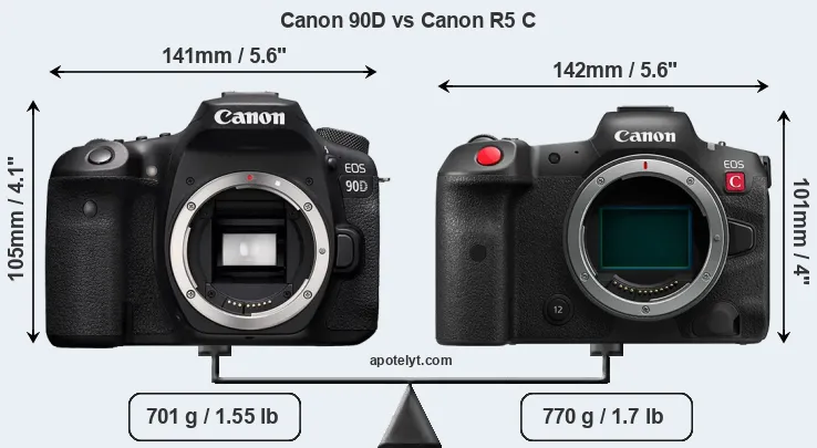 An illustration of the physical size and weight of the Canon 90D and the Canon R5 C is provided in the side-by-side display below. The two cameras are presented according to their relative size. Three consecutive views from the front, the top, and the rear side are shown. All width, height and depth measures are rounded to the nearest millimeter.
