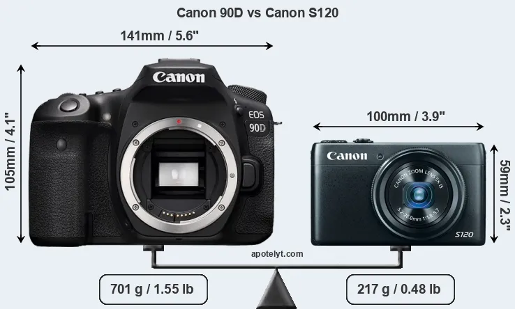 An illustration of the physical size and weight of the Canon 90D and the Canon S120 is provided in the side-by-side display below. The two cameras are presented according to their relative size. Three consecutive views from the front, the top, and the rear side are shown. All width, height and depth measures are rounded to the nearest millimeter.