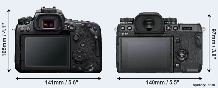 The side-by-side display below illustrates the physical size and weight of the Canon 90D and the Fujifilm X-H1. The two cameras are presented according to their relative size. Three successive views from the front, the top, and the rear are shown. All width, height and depth measures are rounded to the nearest millimeter.