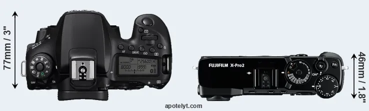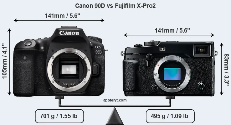 The side-by-side display below illustrates the physical size and weight of the Canon 90D and the Fujifilm X-Pro2. The two cameras are presented according to their relative size. Three consecutive views from the front, the top, and the rear side are shown. All width, height and depth dimensions are rounded to the nearest millimeter.