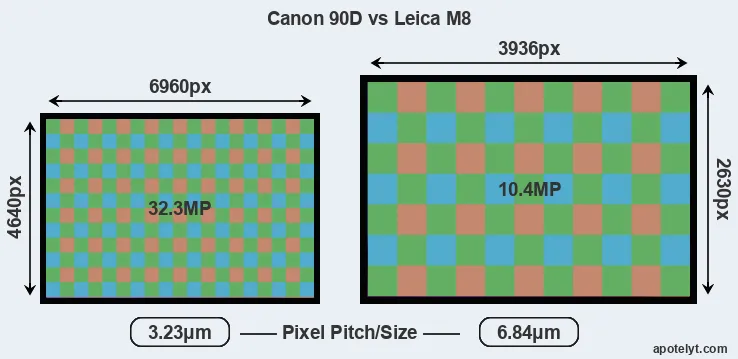 Despite having a smaller sensor, the Canon 90D offers a higher resolution of 32.3 megapixels, compared with 10.4 MP of the Leica M8. This megapixels advantage comes at the cost of a higher pixel density and a smaller size of the individual pixel (with a pixel pitch of 3.23μm versus 6.84μm for the M8). However, it should be noted that the 90D is much more recent (by 12 years and 11 months) than the M8, and its sensor will have benefitted from technological advances during this time that make it possible to gather light more efficiently. Coming back to sensor resolution, it should be mentioned that the M8 has no anti-alias filter installed, so that it can capture all the detail its sensor resolves.