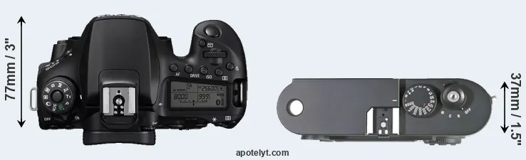 An illustration of the physical size and weight of the Canon 90D and the Leica M8 is provided in the side-by-side display below. The two cameras are presented according to their relative size. Three successive views from the front, the top, and the rear are shown. All width, height and depth measures are rounded to the nearest millimeter.