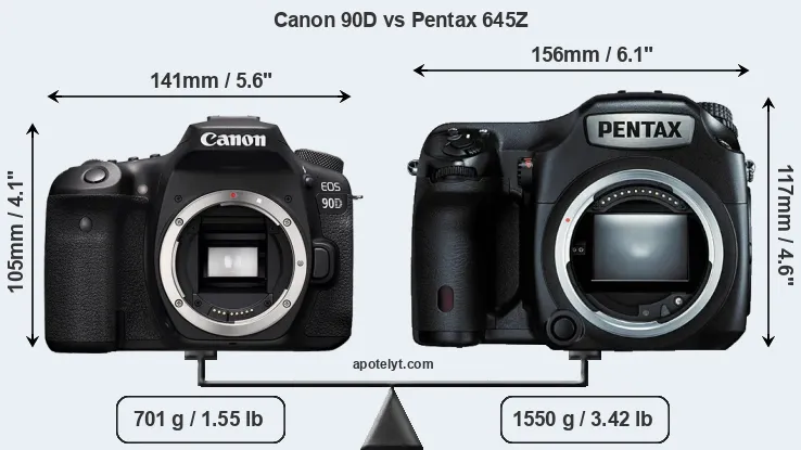 The side-by-side display below illustrates the physical size and weight of the Canon 90D and the Pentax 645Z. The two cameras are presented according to their relative size. Three successive views from the front, the top, and the rear are shown. All width, height and depth dimensions are rounded to the nearest millimeter.