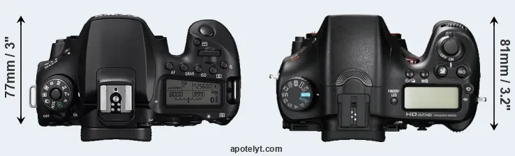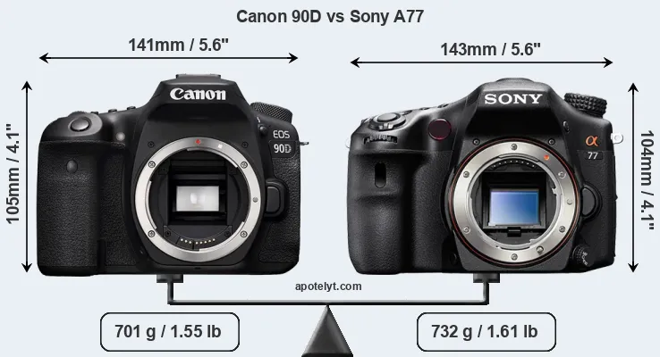 An illustration of the physical size and weight of the Canon 90D and the Sony A77 is provided in the side-by-side display below. The two cameras are presented according to their relative size. Three successive views from the front, the top, and the rear are shown. All width, height and depth dimensions are rounded to the nearest millimeter.