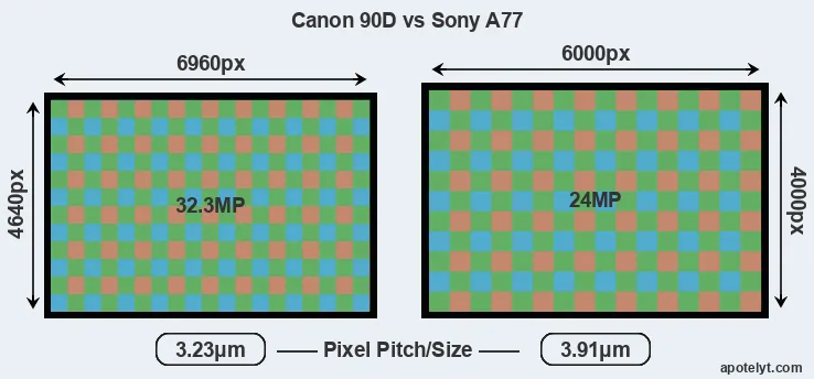 Despite having a smaller sensor, the Canon 90D offers a higher resolution of 32.3 megapixels, compared with 24 MP of the Sony A77. This megapixels advantage comes at the cost of a higher pixel density and a smaller size of the individual pixel (with a pixel pitch of 3.23μm versus 3.91μm for the A77). However, it should be noted that the 90D is much more recent (by 8 years) than the A77, and its sensor will have benefitted from technological advances during this time that make it possible to gather light more efficiently.