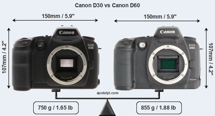 In this particular case, the Canon D30 and the Canon D60 have exactly the same width and height, and, thus, have identically-sized bodies. However, the D60 is markedly heavier (14 percent) than the D30. In this context, it is worth noting that neither the D30 nor the D60 are weather-sealed.