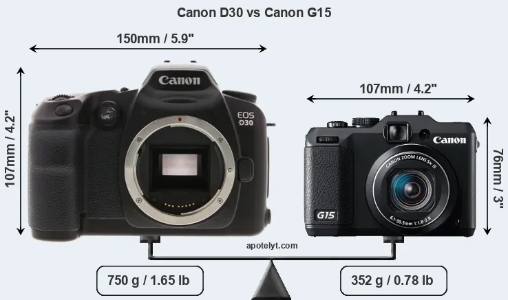 The physical size and weight of the Canon D30 and the Canon G15 are illustrated in the side-by-side display below. The two cameras are presented according to their relative size. Three successive views from the front, the top, and the rear are shown. All width, height and depth dimensions are rounded to the nearest millimeter.