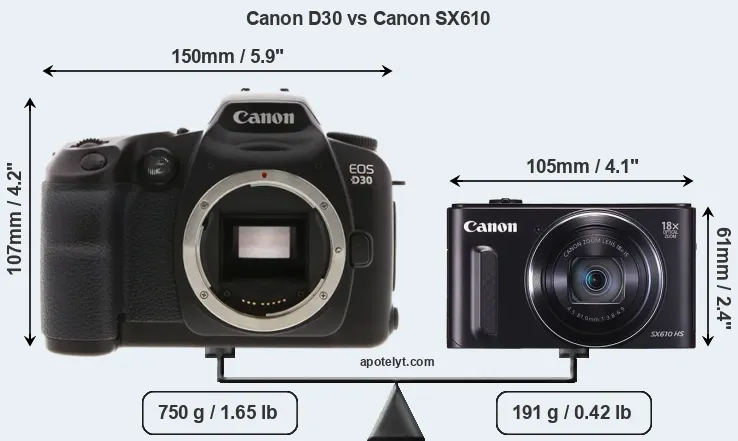 The side-by-side display below illustrates the physical size and weight of the Canon D30 and the Canon SX610. The two cameras are presented according to their relative size. Three consecutive perspectives from the front, the top, and the back are available. All width, height and depth measures are rounded to the nearest millimeter.