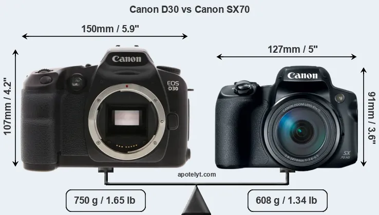 An illustration of the physical size and weight of the Canon D30 and the Canon SX70 is provided in the side-by-side display below. The two cameras are presented according to their relative size. Three successive views from the front, the top, and the rear are shown. All size dimensions are rounded to the nearest millimeter.