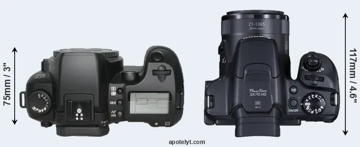 | 2. | Canon SX70 | 127 mm | 91 mm | 117 mm | 608 g | 325 | n | Sep 2018 | US$ 549 | amazon.com | |
