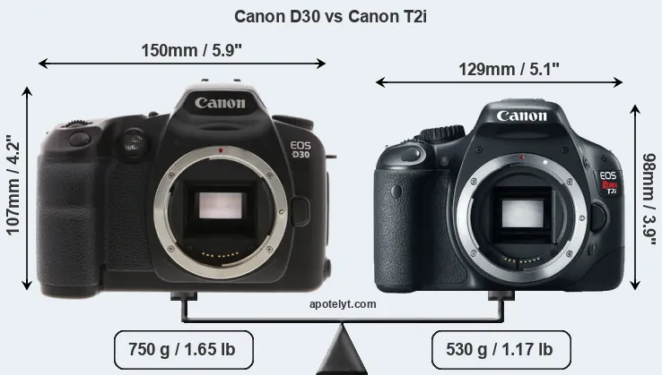 The physical size and weight of the Canon D30 and the Canon T2i are illustrated in the side-by-side display below. The two cameras are presented according to their relative size. Three consecutive views from the front, the top, and the rear side are shown. All width, height and depth dimensions are rounded to the nearest millimeter.