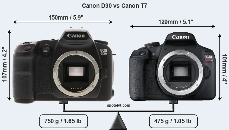 The physical size and weight of the Canon D30 and the Canon T7 are illustrated in the side-by-side display below. The two cameras are presented according to their relative size. Three consecutive perspectives from the front, the top, and the back are available. All width, height and depth dimensions are rounded to the nearest millimeter.