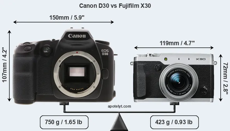 The physical size and weight of the Canon D30 and the Fujifilm X30 are illustrated in the side-by-side display below. The two cameras are presented according to their relative size. Three consecutive perspectives from the front, the top, and the back are available. All width, height and depth measures are rounded to the nearest millimeter.