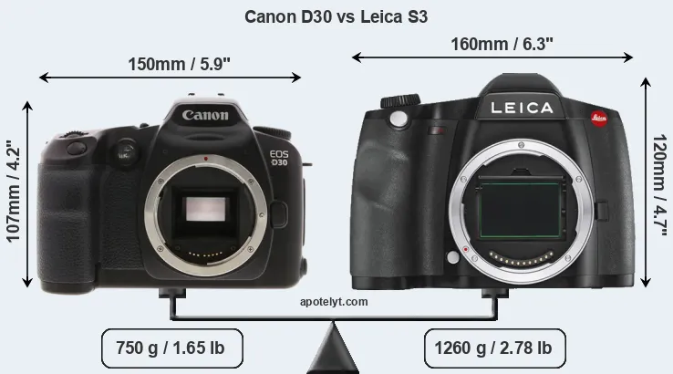 If the front view area (width x height) of the cameras is taken as an aggregate measure of their size, the Leica S3 is notably larger (20 percent) than the Canon D30. Moreover, the S3 is substantially heavier (68 percent) than the D30. It is noteworthy in this context that the S3 is splash and dust-proof, while the D30 does not feature any corresponding weather-sealing.