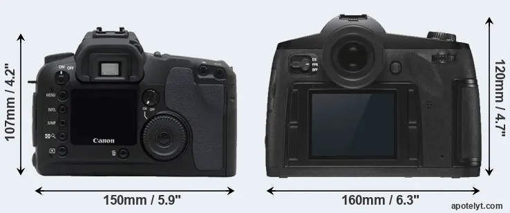 The physical size and weight of the Canon D30 and the Leica S3 are illustrated in the side-by-side display below. The two cameras are presented according to their relative size. Three consecutive views from the front, the top, and the rear side are shown. All size dimensions are rounded to the nearest millimeter.