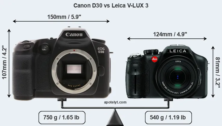 The side-by-side display below illustrates the physical size and weight of the Canon D30 and the Leica V-LUX 3. The two cameras are presented according to their relative size. Three successive views from the front, the top, and the rear are shown. All width, height and depth measures are rounded to the nearest millimeter.