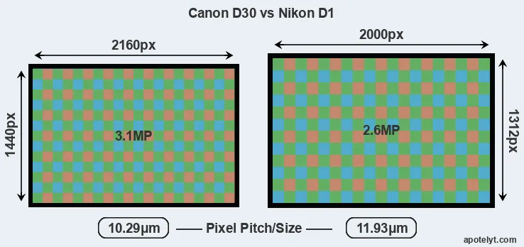Despite having a smaller sensor, the Canon D30 offers a higher resolution of 3.1 megapixels, compared with 2.6 MP of the Nikon D1. This megapixels advantage comes at the cost of a higher pixel density and a smaller size of the individual pixel (with a pixel pitch of 10.29μm versus 11.93μm for the D1). However, it should be noted that the D30 is a somewhat more recent model (by 11 months) than the D1, and its sensor might have benefitted from technological advances during this time that partly offset its pixel-size disadvantage.