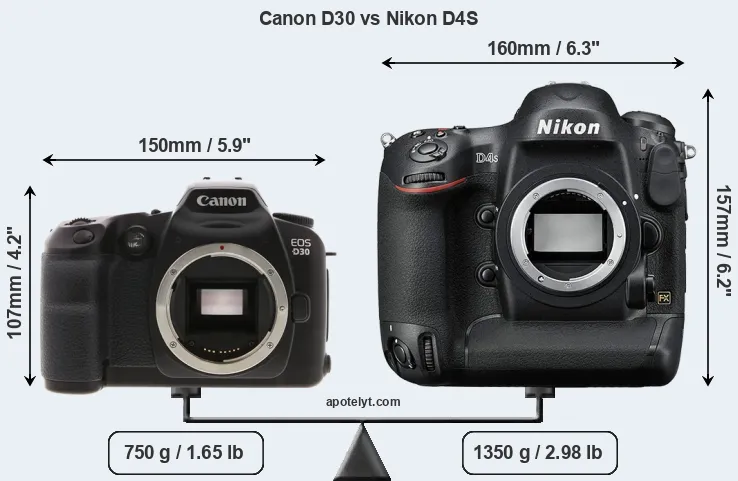 An illustration of the physical size and weight of the Canon D30 and the Nikon D4S is provided in the side-by-side display below. The two cameras are presented according to their relative size. Three consecutive perspectives from the front, the top, and the back are available. All width, height and depth measures are rounded to the nearest millimeter.