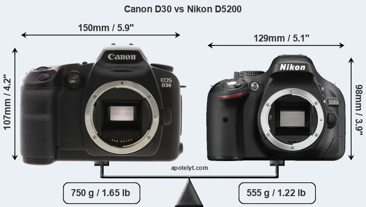 The physical size and weight of the Canon D30 and the Nikon D5200 are illustrated in the side-by-side display below. The two cameras are presented according to their relative size. Three successive views from the front, the top, and the rear are shown. All width, height and depth measures are rounded to the nearest millimeter.