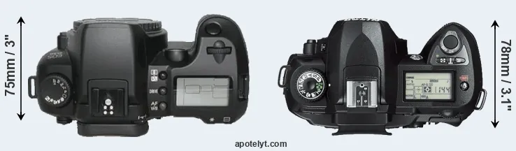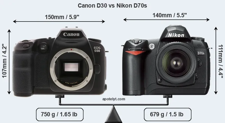 The side-by-side display below illustrates the physical size and weight of the Canon D30 and the Nikon D70s. The two cameras are presented according to their relative size. Three consecutive perspectives from the front, the top, and the back are available. All width, height and depth measures are rounded to the nearest millimeter.