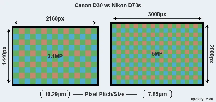 With 6MP, the D70s offers a higher resolution than the D30 (3.1MP), but the D70s has smaller individual pixels (pixel pitch of 7.85μm versus 10.29μm for the D30). Yet, the D70s is a much more recent model (by 4 years and 11 months) than the D30, and its sensor will have benefitted from technological advances during this time that enhance the light gathering capacity of its pixel-units.